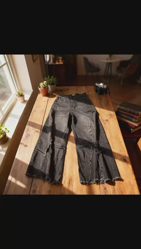 Step up your streetwear game with our Distressed Black Wide-Leg Jeans, the ultimate blend of edge and effortless cool. These jeans feature a relaxed wide-leg silhouette with raw, frayed seams that add just the right amount of attitude. Made from durable black denim with a subtle faded wash, they deliver comfort, movement, and a modern, lived-in look.
